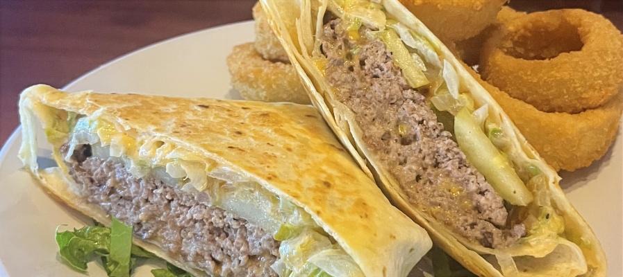 2 smash burgers, American cheese, 1,000 island, shredded lettuce, pickles, onions, grilled tortilla.